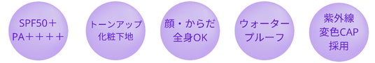 SPF50より日焼け止め効果の高い「SPF50+」で紫外線からしっかりと肌を守りながらも、植物由来美容成分※を複数配合し、潤いと美容成分を同時補給。紫外線カットとスキンケアが同時に行え、下地としてもOK。肌の黄ぐすみを美しくカバーするスミレカラーで透明感とツヤ感を生み出し、光を味方にしたスルンと滑らかで明るい美肌へとトーンアップ。