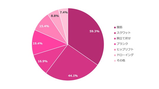続いて、「自宅で筋トレ」「スポーツジムでのトレーニング」を行ったと回答した方へ、どのようなトレーニングを行ったか聞いたところ、「腹筋」と回答した方が59.3%と6割にのぼりました。気になるお腹周りを直接的に鍛え引き締めたいと考えていることがうかがえます。つづいて「スクワット」が44.1%となり、腹筋同様気になる方が多く、大きい筋肉である脚周りを鍛える方が多いことがわかります。