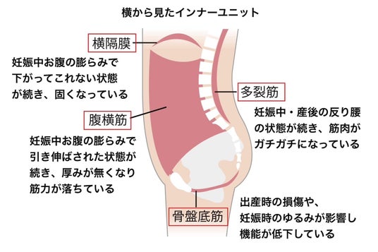 (お腹は引き伸ばされ、横隔膜・多裂筋は硬くなり、骨盤底筋はお産により損傷を受け傷ついている)