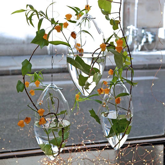 テーブルに自立することができず、ケーブルにぶら下がりながら風のチカラでゆらゆらと揺れ動く、変わりものでシンプルな花器。