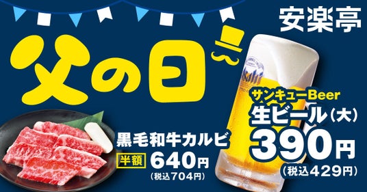 焼肉レストラン安楽亭(本社:埼玉県さいたま市、代表取締役:柳 先)は、2024年6月10日(月)~6月16日(日)の期間、「黒毛和牛カルビ」を半額、「生ビール(大)」を390円(税込429円)、「サンキュープレート」をプレゼントするなど特典をご用意した「父の日キャンペーン」を開催します。