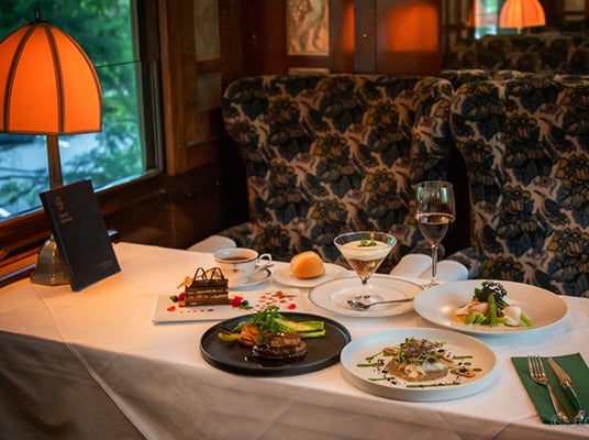 ルネ・ラリックが1928年に室内装飾を手がけ、パリとフランス南部を結ぶ「コート・ダジュール特急」として2001年まで実際に使用された豪華サロンカー「オリエント急行」。本プランでは、通常は9時~17時(当日先着受付順)での営業となっているオリエント急行にて、営業終了後の夜の時間帯に特別にディナー営業をいたします。普段は入ることのできない夜の列車内にて、ラリックの人生や作品をイメージしてエモアテラスのシェフが特別に考案したOtonami限定のスペシャルコースをご提供します。箱根の旬の食材をふんだんに使ったお食事とアートスイーツで構成された特別なディナーコースとともに、ラリックの装飾が幻想的に煌めく夜のオリエント急行内での、美食とアートを堪能する大人なひとときをお愉しみください。