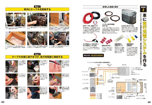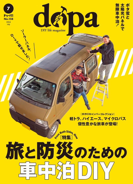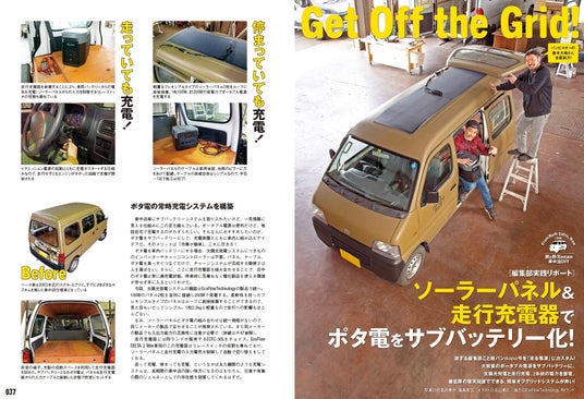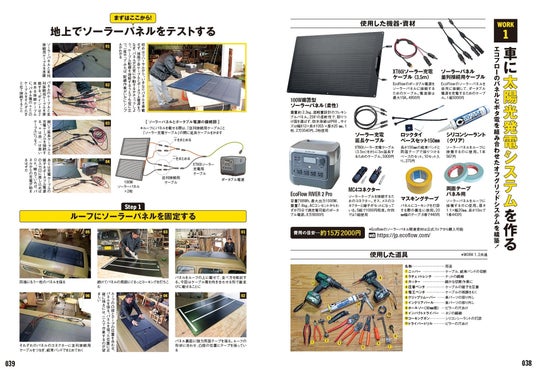 恒例の編集部による実践リポートは、旅する編集部こと軽バンdopa号を「走る電源」にカスタム! 大容量のポータブル電源にソーラーパネルと走行充電器を接続することで、太陽光発電と走行充電、2系統の電力を蓄電。難しい電気知識不要の簡単オフグリッドシステムの構築方法を詳しく紹介します。加えて、防災対策にも役立つポータブル電源とソーラーパネルの組み合わせもていねいに解説。電力自給システムのDIYで、無限車中泊を実現しよう!