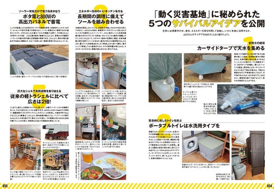 コンパクトながら高い居住性を持つキャンピングカーは、有事の際にはシェルターとしてその力を発揮する。本パートでは「移動式避難所」という観点から旅車をリフレーミング。サバイバル研究家の作る軽トラモバイルシェルターの全データ公開をはじめ、災害支援のプロに聞く緊急時の車中泊避難Q&Aから、もしもに役立つアイデアとテクニックを紹介します。その他、被災地の子どもの心をケアする移動式遊び場トラックなど、モバイルハウスを活用した復興支援の事例も紹介。