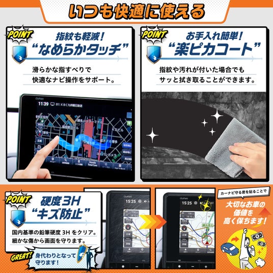 なめらかな指滑りで快適にナビ操作ができ、指紋や汚れが付いた場合でもサッと拭き取ることができます。