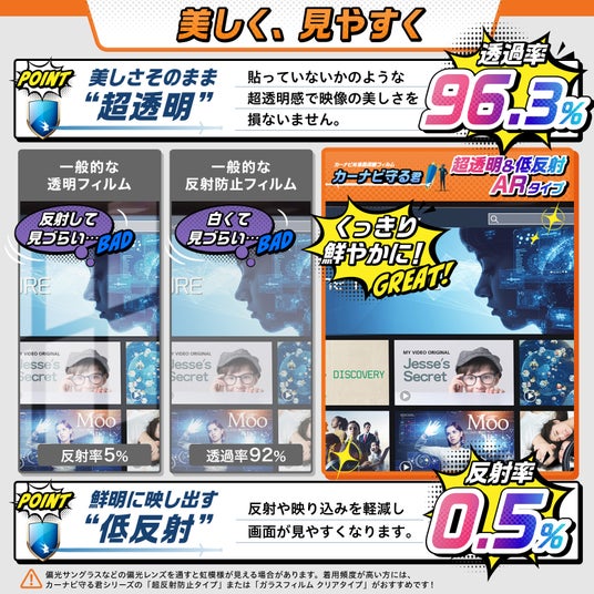 透過率96.3%の超透明感と、反射率0.5%に抑えたハイグレードAR加工で画面をくっきり鮮やかにします。