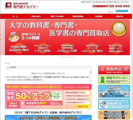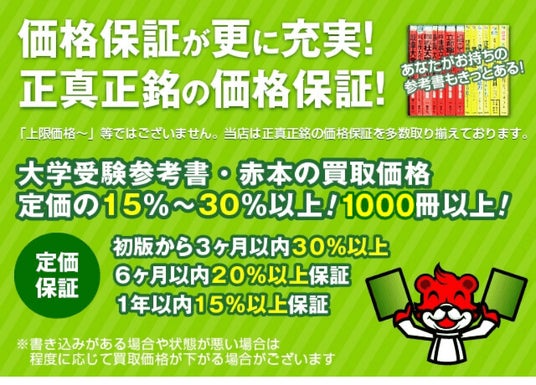 買取では、「学参プラザ(受験参考書・問題集・赤本・予備校テキスト・教材の専門買取店)」「専門書アカデミー(専門書・医学書・大学教科書・資格試験参考書・問題集・予備校テキスト・教材の専門買取店)」「メディカルマイスター(医学書・医療系書籍・予備校テキスト・教材の専門買取店)」の3サイトを展開しています。インターネットから申し込みをして宅配便の着払いで送るだけの簡単買取。全国から送料無料で買取可能。ご希望の方には段ボール無料送付サービスも行っています。