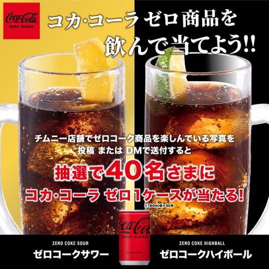 同期間内に店舗へご来店の上、コカ・コーラ ゼロを使用した商品の写真をSNSに投稿したお客様の中から抽選で40名様にコカ・コーラ ゼロ1ケースをプレゼントいたします。