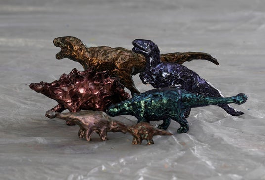 顔のパーツや輪郭を覆い隠すように塗りつぶされた恐竜のフィギュアや木彫りの熊は、人の記憶のあいまいさと、作家自身が捉える世界の揺らぎが表現されています。