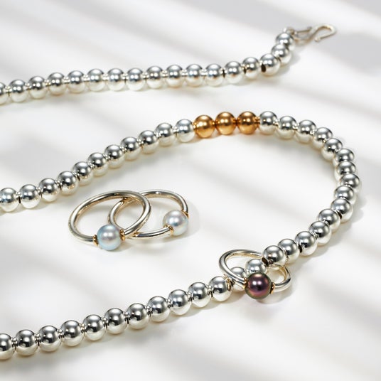 ユニセックスなオリジナルアイテムの種類はネックレス、バングル、リング、ピアスと幅広く、素材はシルバー、金ロウ、パールなど貴金属の価値を追求。ぜひ店舗でお手に取って、その質感やディテールをご確認ください。