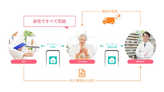 自宅からHomeLinkアプリで医療各施設につながり、診療・服薬指導・薬の宅配まで全て完結