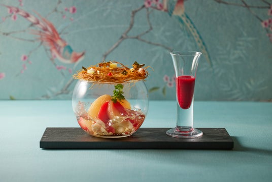 7・8月は、赤ワインでコク深く仕立てたジューシーな桃のコンポートをラウンドグラスに盛り付けた締めパフェ『大人のピーチメルバ』をご用意します。ピーチメルバは、甘くてジューシーな桃のコンポートとバニラアイス、フランボワーズソースを合わせた、見た目も味わいも華やかなデザートです。赤ワインのコンポートとピーチリキュールを使用した爽やかなジュレに、濃厚でまろやかなバニラアイスとクリーム、サクサクとした食感が特徴のカダイフと合わせ、大人の味わいに仕上げました。鮮やかな色合いと、甘酸っぱさがアクセントのフランボワーズソースをお好きなタイミングで注ぎ、味の変化をお楽しみください。