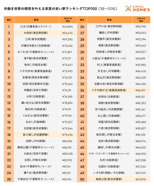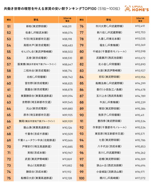 ・共働き世帯の理想を叶える家賃の安い駅ランキングTOP100を公開