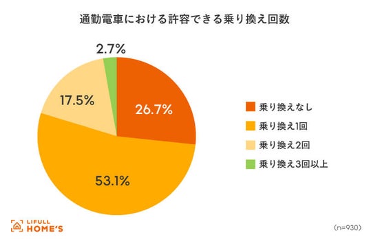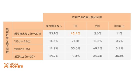 ・通勤における乗り換えの許容回数は過半数が「1回」