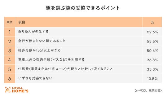 駅を選ぶ際に妥協できる条件の1位は「乗り換えが発生する」(62.6%)、続いて「急行が停まらない駅であること」(55.5%)、「徒歩分数が15分以上かかる」(50.4%)となりました。