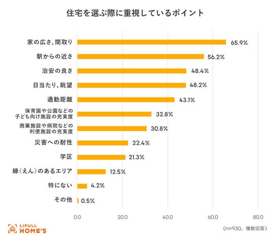 住宅を選ぶポイントとして共働き世帯の65.9%が「家の広さ、間取り」を選択。「駅からの近さ」「通勤距離」などの立地や勤務地のアクセスの良さも重視されている。