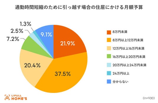 通勤時間短縮のために住居を引越しするとした場合の月額予算については、「8万円以上12万円未満」(37.5%)が最多となりました。「8万円未満」(21.9%)が次に続き、「12万円未満」が過半数を占めました。