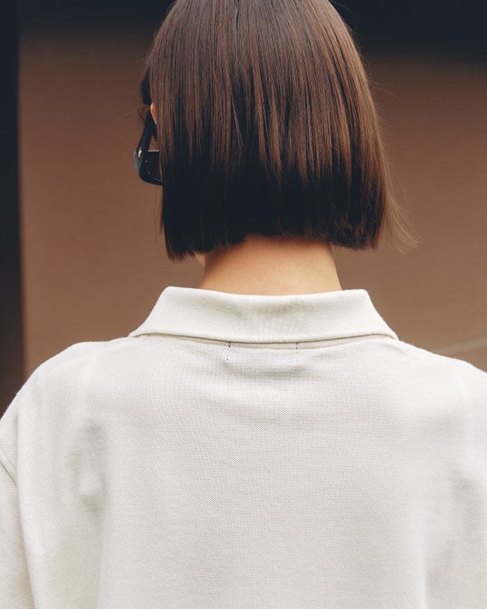 – テニスプレーヤーのアスレティックウェアとして支給されていた襟元にボタンが付かず、汗止めとして ガゼットが付くディテールは活かしながら、当時アスリート向けとして展開された縦長のジャストサイズ フォルムを改良。肩幅や身幅に適度なゆとりを持たせて綺麗な見え方を維持したまま稼働域の広く日常動 作に伴った余白のあるオリジナルパターンへ変更。