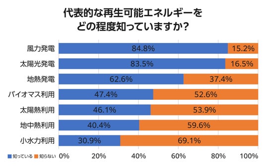 一方で、地中熱利用40.4%や小水力発電30.9%は、よく知らない人の割合がまだまだ多いという結果となりました。