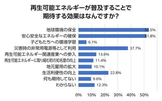 再生可能エネルギーの普及により期待できる効果として、最も高かったのは地球環境の保全53.5%でした。安心安全なエネルギーの確保への期待は51.8%、災害時の非常用電源等としての利用への期待は37.7%、生活利便性の向上は22.8%と、日常生活に近いところや、災害時の電力活用等への期待が高く見られました。