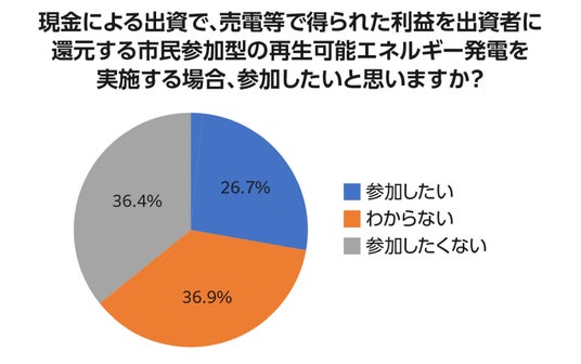 再生可能エネルギー分野への注目が集まるにつれ、市民参加型の再生可能エネルギーへの関心も高まっているようです。市民が出資して配当を得ることができる、市民ファンド型の再生可能エネルギー発電事業に参加したいと考える人は4人に1人。26.7%という結果となりました。