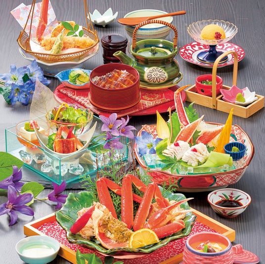 一品ずつ丁寧に調理されたこだわりの品々をクリスタル三段重に宝物のように詰め込んだ女性に人気の「夕顔」。他にも名物のかにすき鍋や茹でがに、かに天ぷらなどかに料理もしっかり堪能いただける特別御膳をご賞味ください。