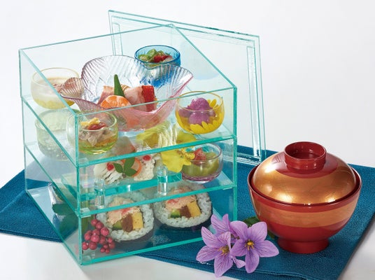 見た目も涼しげなクリスタルの三段重が女性に人気の【夕顔/ゆうがお】