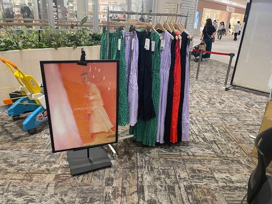 SDGsワークショップにあわせて、ナルミヤ・インターナショナルは自社ブランドのロゴがプリントされたオリジナル缶バッジをつくるワークショップを開催しました。それぞれのワークショップが開催されたブースの前にはワールドのレディースブランド「OPAQUE. CLIP(オペークドットクリップ)」とティーンズ向けのブランド「PINK-Latte(ピンクラテ)」の今春夏の商品を展示、ブース全体でファッションを楽しんでいただきました。