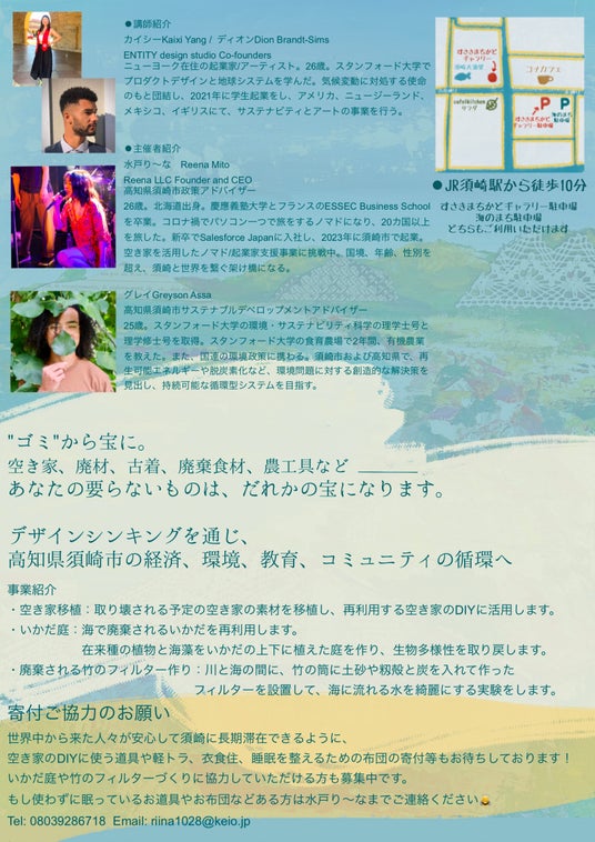 合同会社Reena(高知県須崎市、代表:水戸り~な)は、須崎市の後援で、2024年6月16日(日) に世界で活躍する若手起業家/IT社員/ノマド/アーティストなど15人と高知県民15人が須崎市の持続可能な未来について考えるデザインシンキングワークショップを開催します。須崎市とグローバルの連携を見据えたプロジェクトの第3弾になります。