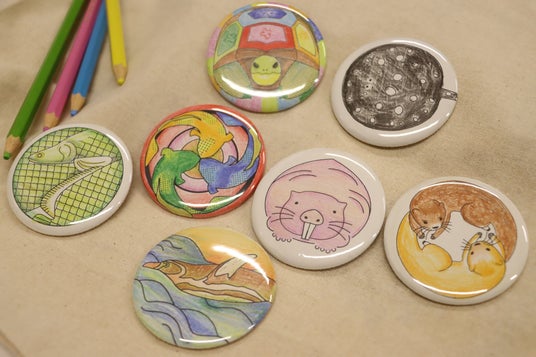 生きものの模様やデザインに色を塗って、オリジナル缶バッジを作りましょう。