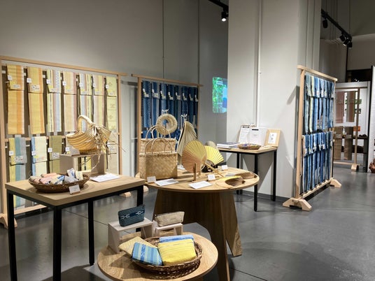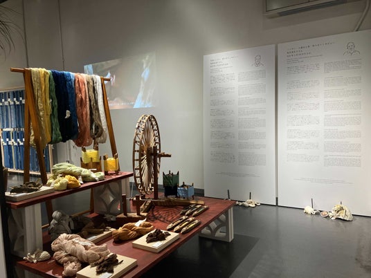 会場には色とりどりの100本のミンサー帯が並び、さんちの風景とつくり手の想いを届ける動画も上映。また、さんちからお持ちいただいた道具や染料、糸などを展示し、その他にもミンサー帯の歴史を綴ったパネル、やまとのミンサー帯の特徴である天然染料の奥深い魅力を記したパネルも設置。京都での開催ということもあり、海外の方に向けた英訳も掲載し、国籍を問わずご覧いただけるようにいたしました。