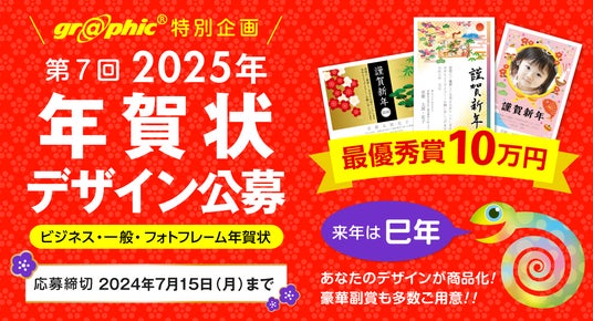 株式会社グラフィック(本社:京都市伏見区、代表取締役社長:西野能央、以下「当社」)はネット印刷事業にて、「第7回 2025年 年賀状デザイン公募」を開催。巳年のオリジナル年賀状デザインを募集します。最優秀賞には賞金10万円、特別賞にはApple Watchなど豪華副賞を多数ご用意しております。