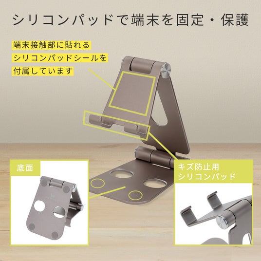 折りたたむと厚さ約45mmとコンパクトで、持ち運びや収納も便利です。また、接触面にはキズ防止用シリコンパッドが付いており、端末を傷つけず滑り落ちない仕様です。