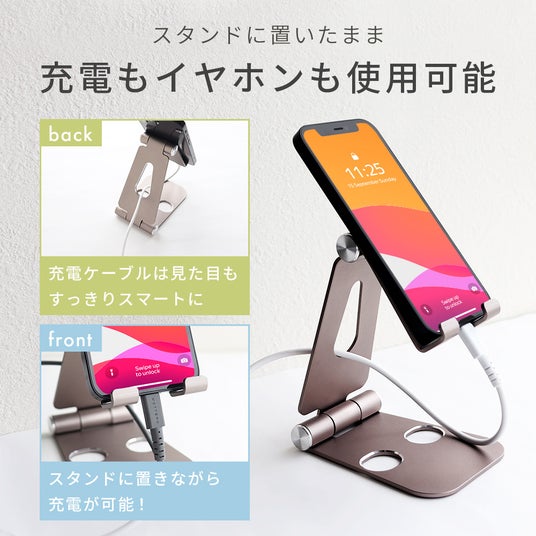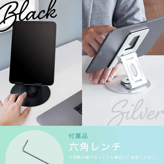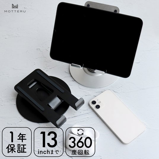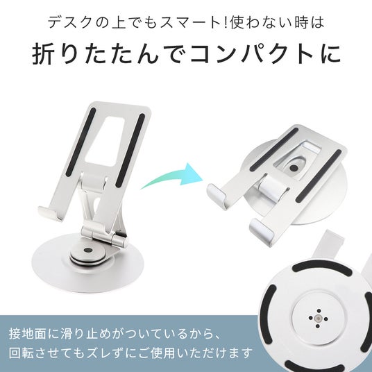 このスタンドは13インチまでのスマートフォンやタブレットに対応しており、台座が360度回転するため自由に向きを変えることが可能です。