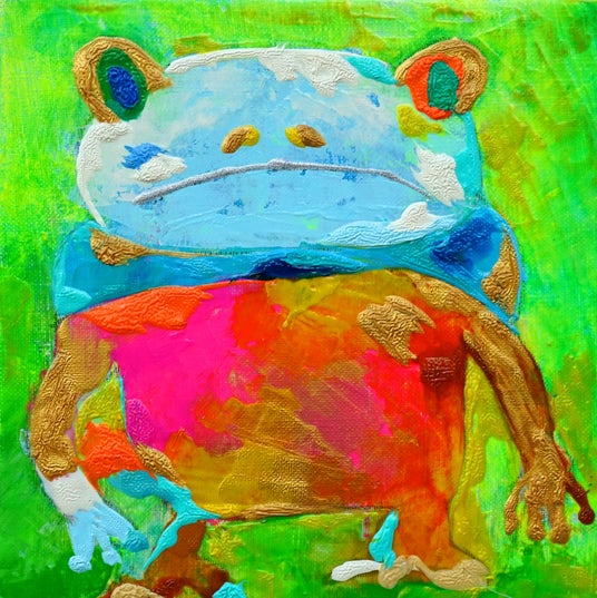 衣笠泰介が描く「カエル」は根強いファンが多く、これまでも複数作品が描かれています。その中でも、まっすぐな眼差しでこちらを見つめるカエルを描いた「旅に出ます」は、その可愛らしさと何処となく真の通った強さを感じられるカエルの表情が魅力です。その勇ましい表情は、人生の一大決心をして、旅に出るカエルの心境を描きたかったのかもしれません。衣笠の特徴でもある、厚く塗られた絵の具の質感までが表現されたアートTシャツは、着る人にとっても特別な一着となります。