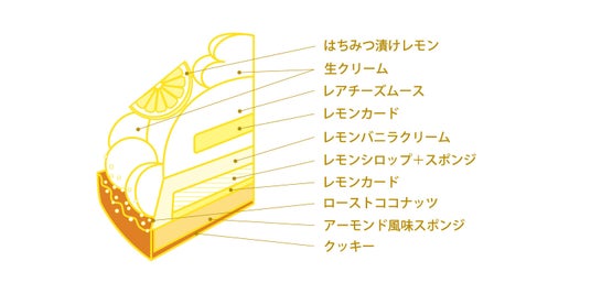 それぞれの美味しさにこだわった7層が絶妙なバランスで調和し、口に入れると、レアチーズムースの繊細な味わいとふわっとした口どけ、レモンカードの爽やかな優しい香りが広がります。さらに、なめらかなレモンバニラクリームに、レモンシロップを染み込ませたスポンジ、絞った生クリーム土台のクッキータルトとアクセントのローストココナッツ。それぞれの美味しさが一体となり、バランスの取れた爽やかでクリーミーな美味しさをお楽しみいただけます。