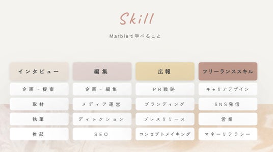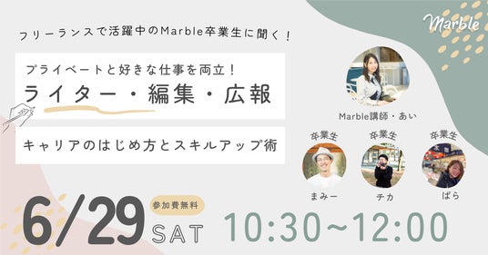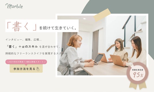 書く+αのスキルで持続可能なフリーランスライフを目指す「Marbleスクール」は、フリーランスやライターの皆さまの学習ニーズや、リスキングによる多様なキャリア形成を支援するため、このたび4期生を募集いたします。