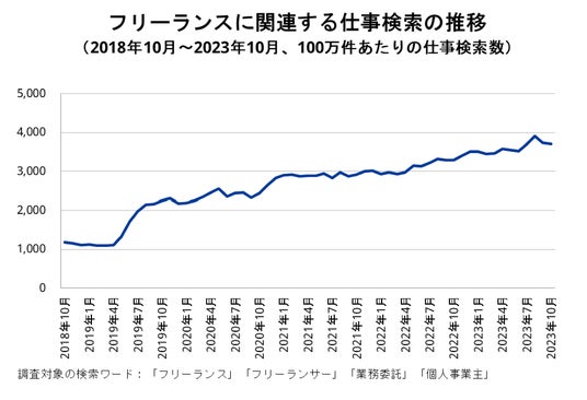 働き方の多様化や企業の副業解禁にともない、時間や場所の制約を受けにくいフリーランスに注目が集まっています。Indeed Japan 株式会社が2018年10月~2023年10月に行った「フリーランスに関する仕事の検索動向の調査」では、「フリーランス」に関するキーワードの仕事検索数は5年間で3.1倍に増えています。
