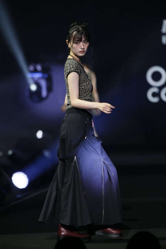 「レトロ」「カジュアル」をメインコンセプトに、独自のアクセントをプラスした、ルールレスなコレクションを展開する「Boka nii」は、プロデューサーを務めるYouTuberかすがオールブラックコーデにキラキラとした夏らしさをプラスしたルックで登場。モデルの那須ほほみは、グレートップス×ブラックデニムのクールでアーバンなスタイルをまとい、爽やかな笑顔で会場を魅了しました。