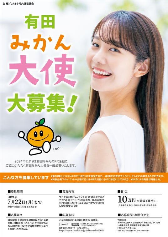 JAありだ共選協議会は「有田みかん」を広くPRして頂ける「有田みかん大使」を募集いたします。有田みかんの更なる消費拡大に努めるJAありだ共選協議会は、全国に広く有田みかんの魅力を発信する活動のお手伝いをして頂ける「有田みかん大使」を募集いたします。「有田みかん大使」の募集は今年で10期目を迎えます。