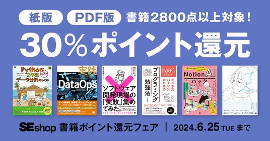 株式会社翔泳社(本社:東京都新宿区⾈町5、社長:佐々木幹夫)の運営する公式通販サイトSEshopは、 2024年6月18日(火)から6月25日(火) まで紙版書籍・PDF版電子書籍の新刊含む2800タイトル以上が30%ポイント還元となる「書籍ポイント還元フェア」を開催します。