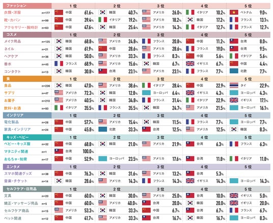 23カテゴリ中、「中国」は11カテゴリで1位。「韓国」は6カテゴリで1位、8カテゴリで2位という結果に。中国はファッション、インテリア、キッズ・ベビー、セルフケア・日用品というカテゴリにおいて人気が高く、韓国はコスメ、食、エンタメが人気だった。