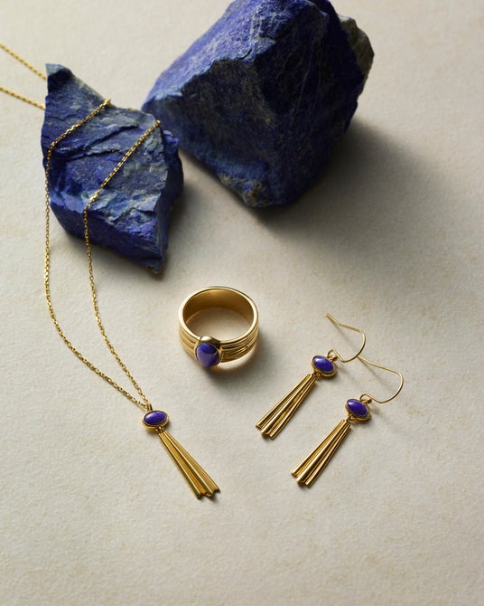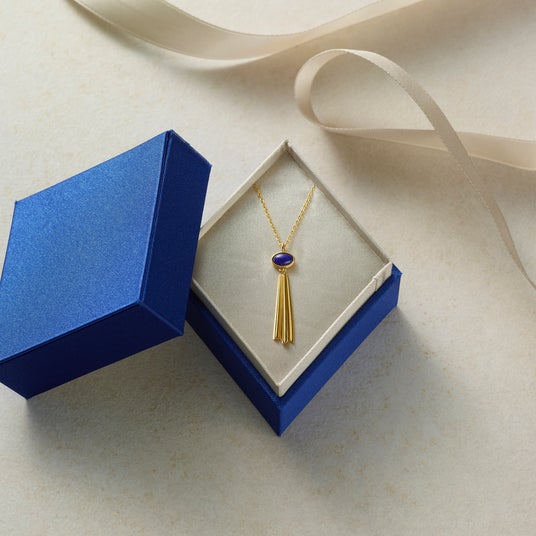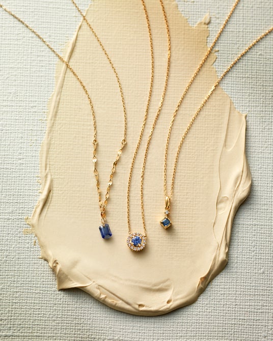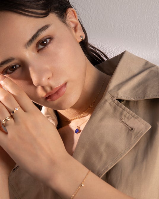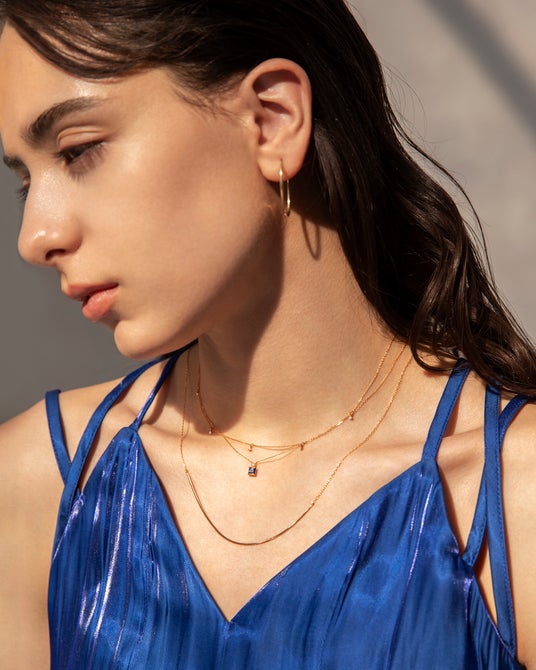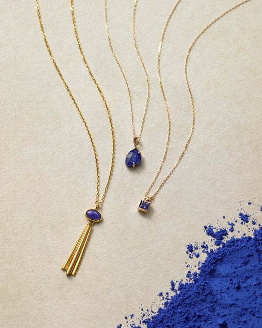 すみれ色のようなアイオライトのネックレス。アイオライトは絵の具のパレットの形をイメージし、プリンセスカットをセレクト。石に細やかなカットを施すことで光が当たるたび繊細にきらめき、自然由来の美しいブルーの色を楽しめます。