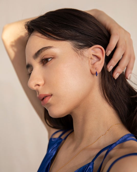 深みのあるブルーが印象的なラピスラズリのピアス。縦長なしずくの形にカットしたラピスラズリが揺れ、大人っぽい印象に。トップには鮮やかなルビーをセッティング。ラピスラズリの深みのあるブルーと鮮やかなルビーの組み合わせが新鮮。ピアス ¥33,000<K10YG/ラピスラズリ/ルビー>◆:数量限定品 ◇:2025年1月13日までの期間限定プライス