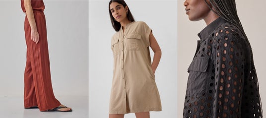 アースカラーのシャツドレスやプルオンパンツ、アイレットのクロップドシャツなど、汎用性の高いファッショナブルなアイテムを展開