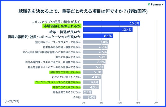 男女で比較すると、「スキルアップや成長の機会が多く市場価値を高められるか」に関しては男女ともに最も重視する項目であるが、2位以降で違いが見られた。男性は、スキルアップや成長の機会の次に、「給与・待遇が良いか(15.5%)」や「職場の雰囲気・社風・コミュニケーションが良いか(8.6%)」を重視している。一方で、女性は、「魅力的なサービス・プロダクトであるか(12.0%)」や「SDGsへの取り組みがあるか(10.7%)」が続く。