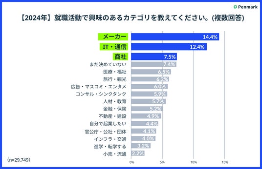 Z世代が就職活動で興味のある分野は、1位「メーカー(14.4%)」、2位「IT・通信(12.4%)」、3位「商社(7.5%)」となった。