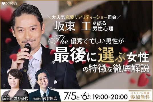 恋愛結婚のパーソナルトレーニング「parcy’s」(以下、パーシーズ)を提供する株式会社イグアス(本社:長崎県長崎市、代表取締役CEO:中村 あきら)は、人気恋愛リアリティショーの司会進行役や、俳優、アーティストとしても活動する坂東工さんをお呼びして、「優秀で忙しい男性が最後に選ぶ女性の特徴を徹底解説セミナー」(参加無料)を2024年7月5日(金)、7月6日(土)にオンラインにて開催いたします。