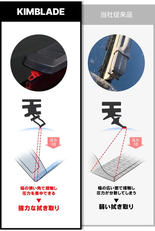 KIMBLADEの四角形ワイパーは強力なエッジと相まって、効率的に水滴を拭き取ることができます。対照的に、従来の逆三角形ワイパーゴムは、スムーズに反転できずに水滴が残ることが多くあります。