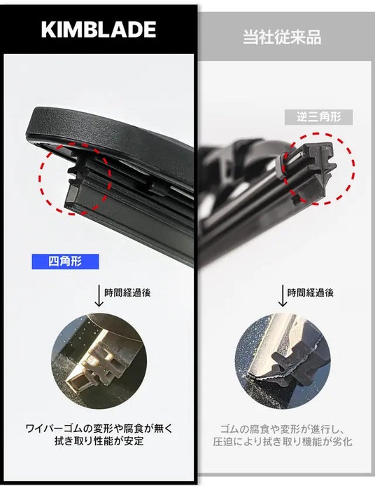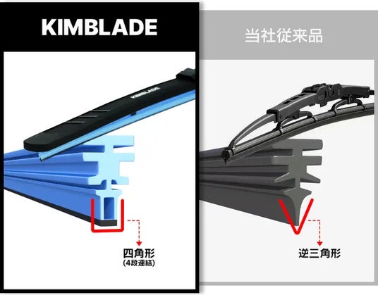 KIMBLADEワイパーの特徴は、フロントガラスに接触するゴムの形状が四角形であることです。100年以上もの間、従来のワイパーゴムのデザインは大きく変わりませんでした。そこに、KIMBLADEが四角形のワイパーゴムを開発し、革命を起こしました。その独自のデザインにより、KIMBLADE のワイパーは、性能と耐久性のいずれにおいても、当社従来品の三角形のワイパーを凌ぐものとなりました。さらに通常のゴムの代わりに、高品質シリコンを使用することによりKIMBLADEワイパーは、気候による腐食や変形に強く、より長く使用することができる製品となりました。